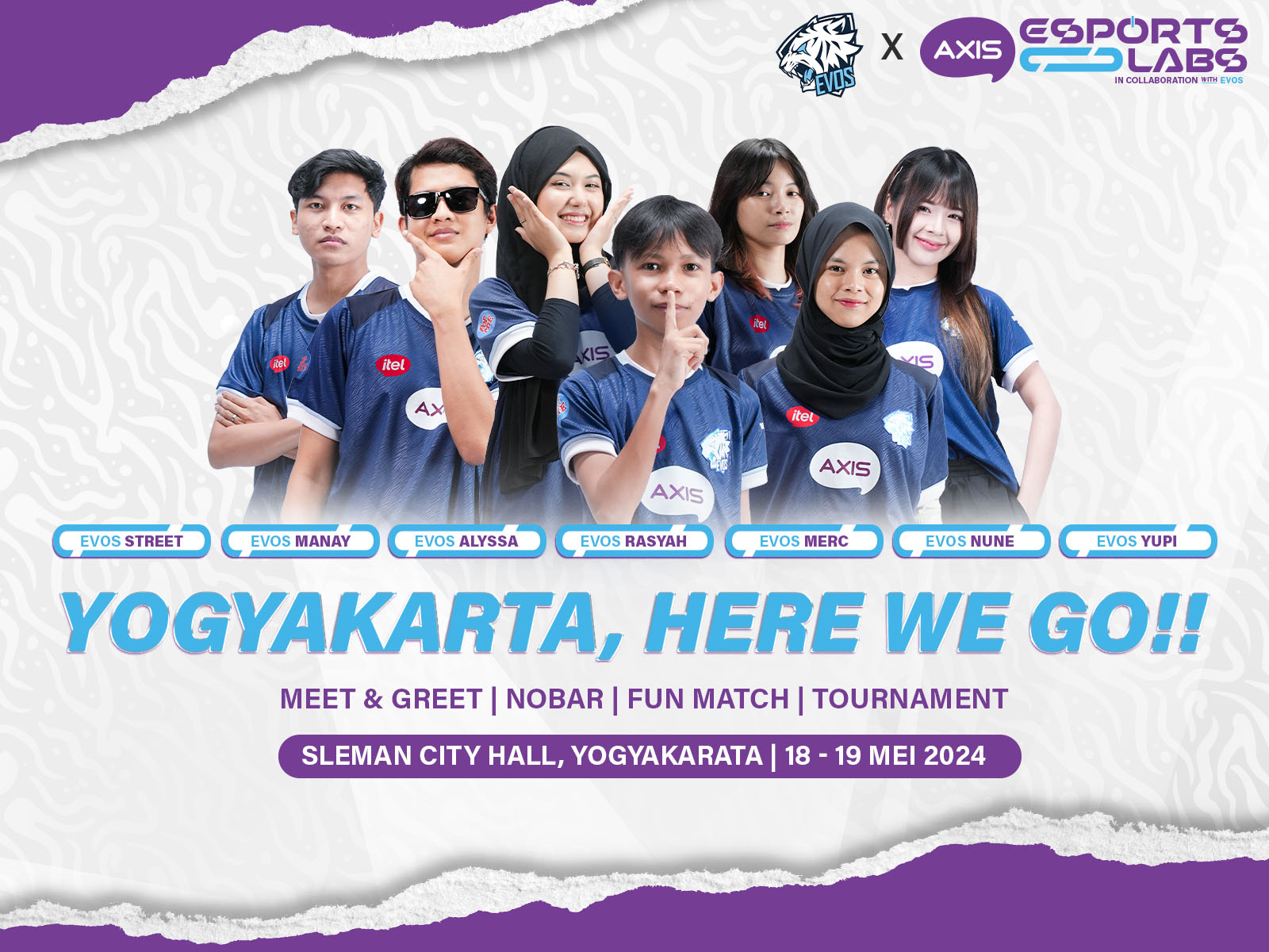 Pada perhelatan di bulan Mei ini, Yogyakarta dipilih oleh tim AXIS dan EVOS untuk menjangkau EVOS Fams dan pencinta esports yang ada di daerah D.I. Yogyakarta dan Jawa Tengah. AXIS Esports Labs Yogyakarta diadakan pada tanggal 18 dan 19 Mei 2024 berlokasi di Sleman City Hall, Yogyakarta dengan menyuguhkan serangkaian aktivitas yang mendekatkan pecinta gaming berkumpul bersatu mulai dari turnamen Mobile Legends dengan total hadiah mencapai Rp 30,000,000, Fun match & By 1 yang menawarkan kesempatan untuk memenangkan koleksi EVOS Goods, serta sesi meet & greet dan aktivitas tanda tangan eksklusif bersama Trio Booyah (EVOS Manay, EVOS Rasyah, EVOS Street), EVOS Alyssa, EVOS Yupi, EVOS Merc dan EVOS Nune.